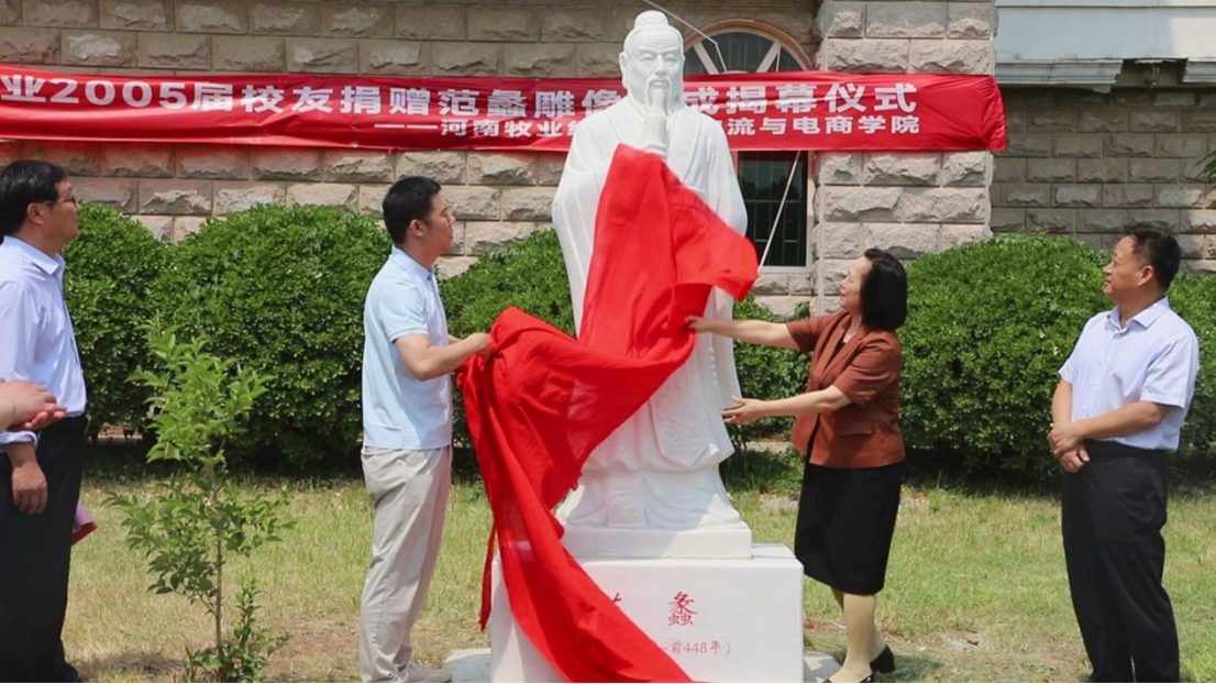 5月29日上午,校长尹新明、副校长席磊出席我校物流管理专业首届毕业生毕业二十周年纪念暨物流管理专业2005届校友见面会,为校友捐赠的范蠡雕像揭幕并颁发捐赠证书。