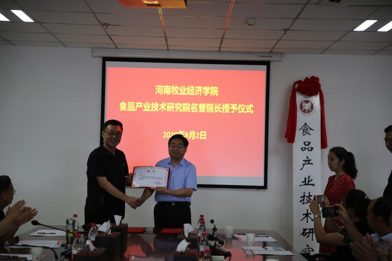 院党委书记穆瑞杰和省工业和信息化厅食品工业办公室主任许新共同为食品产业技术研究院揭牌,并授予陈振杰和吴祖兴为研究院名誉院长。副院长张卫宪代表学校与河南省金米郎食品有限公司、河南思迈尔健康科技有限公司签订总金额为401万元的横向科研项目。
